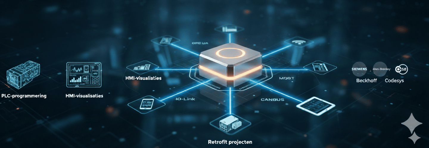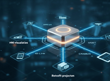 Specialisatie in robuuste PLC-programmering en intuïtieve HMI-visualisaties op alle gangbare platforms (Siemens, Allen-Bradley, Beckhoff, CodeSys). Wij voeren cruciale Retrofit projecten uit om verouderde systemen te vervangen en efficiëntie en veiligheid te optimaliseren.