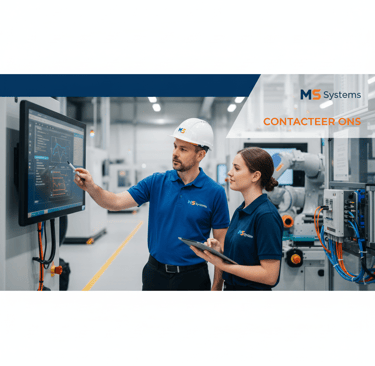 MS Systems levert gespecialiseerde engineering om de efficiëntie, veiligheid en betrouwbaarheid van uw machines en processen te garanderen. Van PLC- en HMI-programmatie tot complexe data-integratie met IoT en Cloud, wij ontwerpen duurzame oplossingen op maat. Onze aanpak is transparant en persoonlijk, met de focus op het realiseren van meetbare resultaten in uw productieomgeving.